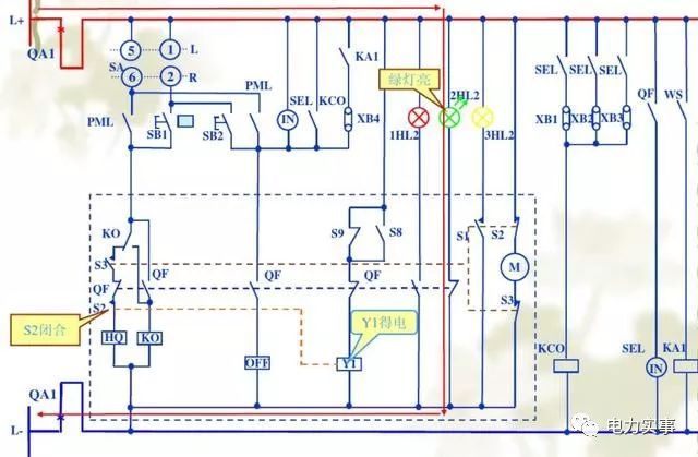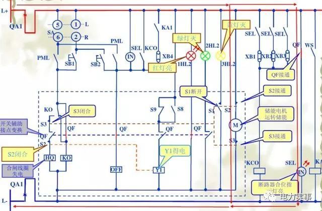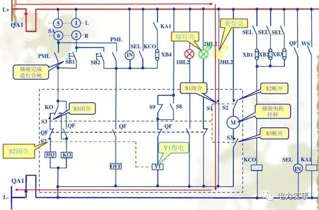 這是關閉期間的狀態。開關接通后,電流將通過2次電擊接通,并流過上圖中的紅線指示。HQ是閉合線圈,它將觸發儲能彈簧動作。同事們,斷路器輔助開關的狀態會隨著閉合而改變。