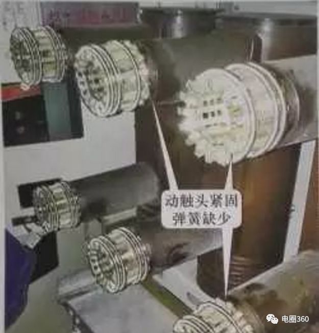 經(jīng)專業(yè)人員檢查,確定母線室和后下柜無發(fā)熱開關(guān)柜,手車甲、乙相母線側(cè)動、靜觸頭和甲相下動、靜觸頭的觸頭部分發(fā)熱。開關(guān)柜電源故障檢查:將手車?yán)鰴C柜。發(fā)現(xiàn)一個壓縮彈簧在手車的a相母線側(cè)(上部)上的移動觸點的端部缺失,并且一個壓縮彈簧在手車的a相母線側(cè)上的下移動觸點的導(dǎo)電桿和b相母線側(cè)上的移動觸點的絕緣外殼側(cè)缺失(見圖17)。當(dāng)檢查手車的靜態(tài)接觸情況時,發(fā)現(xiàn)相應(yīng)的靜態(tài)接觸箱中有一個松動的壓縮彈簧(見圖18)。