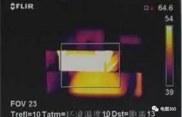 3天后,檢查10KV號主進(jìn)線柜是否停電。將手車?yán)鰴C柜,并立即對手車進(jìn)行紅外測溫(剩余溫度)。手車b相動觸點的總溫度為42°。7℃(剩余溫度)(見圖12),b相動觸頭前端溫度為46℃(剩余溫度)(見圖13),手車母線側(cè)靜觸頭溫度為48。5℃(剩余溫度)(見圖14),0+后穿板套管溫度為39.2℃(剩余溫度)(見圖15),0+前后手車母線側(cè)靜觸頭盒附近母線排溫度為64.6℃(剩余溫度)(見圖16)。這證明手車的手動觸點和靜態(tài)觸點的接觸部分不是熱點,開關(guān)柜后面的穿板套管也不是熱點。1號主進(jìn)線柜手車母線側(cè)靜觸頭座與母線排的接觸部位是熱點。