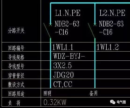L1。并聯(lián)開關上方的N.PE表示通過從火線的三相中選擇一相,并添加零線和地線,形成一個具有220伏電源的1WL1.1回路。導線規(guī)格WDZ-BYJ-3X2.JDG20-CT,CC指低煙無鹵阻燃交聯(lián)聚乙烯絕緣(銅芯)導線,3根2.5平方毫米,直徑20毫米的金屬管,橋架及沿屋面暗敷設。同時,標記該回路用于照明和備用。照明負載為0.32千瓦,相對較小。