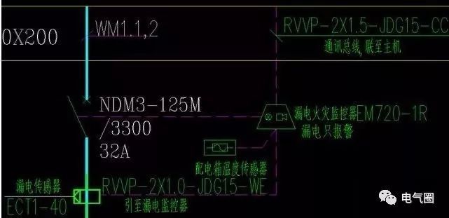 圖紙這一部分的信息量也相對較大,所以要盡量詳細。Wm1.1,2表示它由1.1環(huán)和1.2環(huán)繪制,在上層總照明配電箱;額定電流為32A的NDM125M/3300 32A斷路器;ECT40是一個電子傳感器。確切的名稱應該是剩余電流互感器。根據(jù)前面的電流計算,選擇63A或100A的剩余電流互感器就足夠了。其工作原理是檢測火線和零線(零線)的電流矢量之和,并計算電流損耗,即漏電。配電箱溫度傳感器是電氣火災監(jiān)控系統(tǒng)中檢測配電箱箱溫度、溫度和漏電的標準箱。EM720-1R是一種電氣火災探測器,用于向電氣火災監(jiān)控設備(主機)傳輸泄漏信息、溫度信息和報警信息。使用rvp-2X1.jdg 1cc,即2X1.5平方毫米屏蔽軟線,天花板中隱藏一根直徑為15毫米的金屬管。