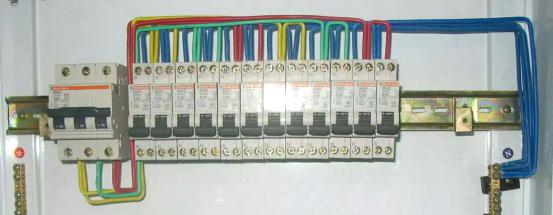 5.連接兩行零線(藍色)、相A(黃色)、相B(綠色)和相C(紅色)后的照片: