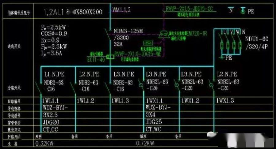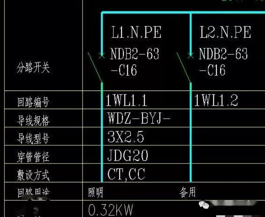 L1。并聯(lián)開關(guān)上方的N.PE指的是采用一路帶電導(dǎo)線,即三項中的一項,加上零線和地線,形成一個1WL1.1回路,電源電壓為220伏。導(dǎo)線規(guī)格WDZ-BYJ-3X2.JDG20-CT,CC指低煙無鹵阻燃交聯(lián)聚乙烯絕緣(銅芯)導(dǎo)線,3根2.5平方毫米,直徑20毫米的金屬管,橋架及沿屋面暗敷設(shè)。同時,標(biāo)記該回路用于照明和備用。照明負載為0.32千瓦,相對較小。