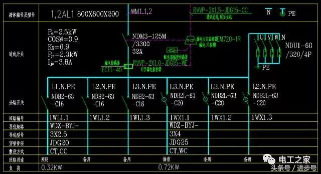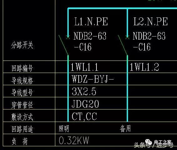 L1。并聯開關上方的N.PE指的是采用一路帶電導線,即三項中的一項,加上零線和地線,形成一個1WL1.1回路,電源電壓為220伏。導線規格WDZ-BYJ-3X2.JDG20-CT,CC指低煙無鹵阻燃交聯聚乙烯絕緣(銅芯)導線,3根2.5平方毫米,直徑20毫米的金屬管,橋架及沿屋面暗敷設。同時,標記該回路用于照明和備用。照明負載為0.32千瓦,相對較小。