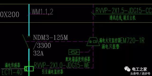 圖紙這一部分的信息量也相對較大,所以要盡量詳細。WM1.1和WM 2表是從1.1回路和1.2回路中得出的,上層的總照明配電箱。帶有附加電流32A的NDM125M/3300 32A斷路器;ECT40是一個電子傳感器。確切的名稱應該是剩余電流互感器。根據以前的電流計算,選擇63A或100A的剩余電流互感器就足夠了。工作原理是檢測器火線和零線(零線)的電流矢量之和,以及電流損耗(即泄漏)的計算。配電箱溫度傳感器,是配電箱箱溫的檢測器,溫度檢測和泄漏檢測屬于電氣火災監控系統的標準箱。EM720-1R是一種電氣火災探測器,用于向電氣火災監控設備(主機)傳輸泄漏信息、溫度信息和報警信息。使用rvp-2X1.jdg 1cc,即2X1.5平方毫米屏蔽軟線,天花板中隱藏一根直徑為15毫米的金屬管。